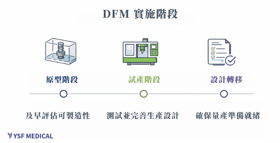 將 DFM 納入產品開發流程,並不是額外增加工作,而是在既有節點中,讓製造端能夠提早參與討論。實務上,真正有價值的 DFM,往往不是一次性的審查,而是隨著專案推進,在關鍵時刻把製造的觀點拉進來,幫助團隊在設計尚未完全定案前,就先避開後面一定會放大的風險。